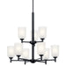 The Shailene 26.5" 9 light 2 tier chandelier features a classic look with its clean lines in Brushed Nickel finish and satin etched glass. The Shailene chandelier works in several aesthetic environments, including traditional and transitional.