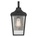 Enhance your curb appeal with the vintage-inspired look of the Forestdale 1-light outdoor wall light. Forestdale's water glass mimics the look of rain cascading down a window and diffuses light in a beautiful vintage glow. Its rich, on-trend textured black finish easily complements various design styles while it's decorative loop arm detail complements updated traditional environments.