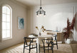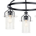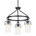 The Everett 22.5 inch 3 light chandelier adds a dash of industrial glam to your space. Three mini Clear Glass pendants are suspended from an open metal circle finished in Black. A delicate clear acrylic disc appears to hold each pendant â and your attention.