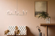 The Alvaro chandelier features a simple silhouette and unique tapered accent. Designed with 90-degree angles, Alvaro starts at the canopy, floats down to the center root of the fixture, and then glides outward and upward with a bloom of light at the end.This fixture also features bobeche on each arm ââ¬" flaring out into the candlestick for a soft modern look.