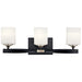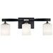 The Marette 22.75" 3 light vanity light with satin etched cased opal glass and twisted arm in Black finish. A perfect addition in several aesthetic environments, including traditional, transitional and modern.