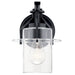 The Everett 9.25 inch 1 light wall sconce adds a dash of industrial glam to your space. A mini Clear Glass pendant is suspended from a curved arm and round backplate in Black. A delicate disc detail helps hold the pendant â and your attention.
