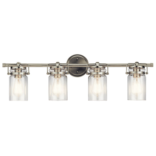 Brinley 32.25" 4 light vanity light features a modern vintage look with its Brushed Nickel finish and clear glass. Inspired by mason jars, the Brin...