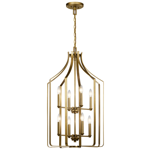 The Morrigan 8 light foyer chandelier in a Natural Brass finish highlights the beauty of candelabras with a modern twist of clean lines, an open ca...