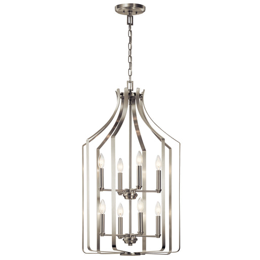The MorriganTM 8-light foyer chandelier in Brushed Nickel finish highlights the beauty of candelabras with a modern twist of clean lines, an open c...