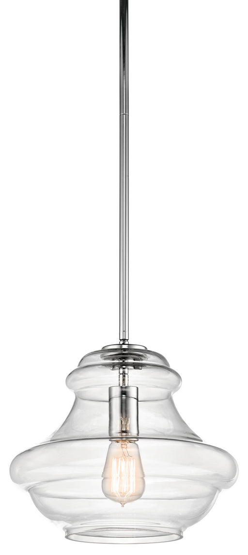 The Everly 10.25" one light schoolhouse shaped pendant comes with a curved, glass blown container featuring clear glass and a Chrome finish for a s...