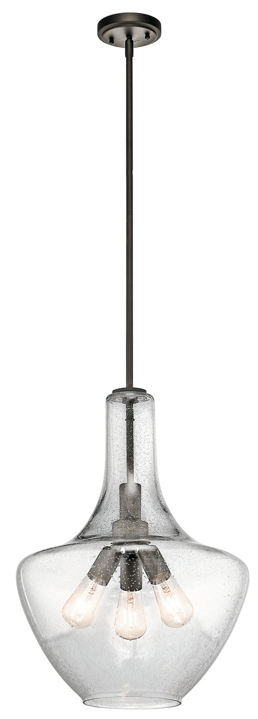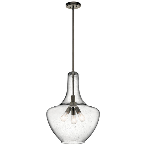 The Everly 27.5" three light bell shaped pendant comes with a curved, glass blown container featuring clear, seeded glass and an Olde Bronze finish...