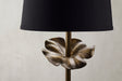 The Metamorphosis Table Lamp has a soft antique brass finish on its tall vase-like brass body encircled by a fluttering leaf. Classical in its lines, the lamp is topped with a black shantung shade that has a gold lining. The black granite base anchors the imaginative profile of this brass lamp.