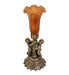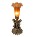 Inspired by the famous Tiffany design from the early 1900s. This mini lamp features a stunning shade mouth blown of fine Amber art glass. The Pond Lily shade is embraced by an elegant cast base featuring two cherubs finished by hand in Antique Brass. The Pond Lily Table Lamp is featured in our American designed, handcrafted Favrile Glass Collection. UL and cUL listed for dry locations. Each shade is a unique work of art with color variations based on natural ingredients inherent in the glass. Contact us if color matching is critical when ordering multiple items.