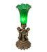 Inspired by the famous Tiffany design from the early 1900s. This mini lamp features a stunning shade mouth blown of fine Green art glass. The Pond Lily shade is embraced by an elegant cast base featuring two cherubs finished by hand in Antique Brass. The Pond Lily Table Lamp is featured in our American designed, handcrafted Favrile Glass Collection. UL and cUL listed for dry locations. Each shade is a unique work of art with color variations based on natural ingredients inherent in the glass. Contact us if color matching is critical when ordering multiple items.