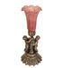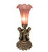 Inspired by the famous Tiffany design from the early 1900s. This mini lamp features a stunning shade that is mouth blown of Lavender art glass. The Pond Lily shade is embraced by an elegant cast base featuring two cherubs finished by hand in Antique Brass The Pond Lily Mini Lamp is featured in our American designed, handcrafted Favrile Glass Collection. UL and cUL listed for dry locations. Each shade is a unique work of art with color variations based on natural ingredients inherent in the glass. Contact us if color matching is critical when ordering multiple items.
