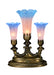 One of the most popular Louis Comfort Tiffany styled lamps on the market today, recreating his famous Favrile design from the early 1900's. This mottled Indigo Blue tipped Pink shaded Three Light Mantelabra offers an attractive, delicate design featuring shades mouth blown of fine art glass. Lily shades are seated in an elegant base finished by hand in Mahogany Bronze.