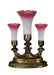One of the most popular Louis Comfort Tiffany styled lamps on the market today, recreating his famous Favrile design from the early 1900's. This softly mottled Plum Pink and White shaded Three Light Mantelabra offers an attractive, delicate design featuring shades mouth blown of fine art glass. Lily shades are seated in an elegant base finished by hand in Mahogany Bronze.