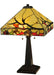 This classic American Arts & Crafts design is defined by Beige art glass highlighted with Bark Brown tree branches that are almost bare after shedding their foliage of leaves in Green, Red and Orange, which are accented with Burgundy Swirl and Gold glass jeweled berries. Authentic art glass pieces were set into the finely detailed design and copperfoiled using Meyda's famous construction process. The base is classic Arts & Crafts finished in a rich Mahogany Bronze.