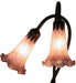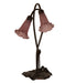 One of the most popular Louis Comfort Tiffany styled lamps on the market today, recreating his famous Favrile design from the early 1900's. This softly mottled Lavender fluted shaded Two Light Accent Lamp offers an attractive, delicate design featuring shades mouth blown of fine art glass. Lily shades are suspended from stems delicately winding above Lily pads bases finished by hand in Mahogany Bronze.