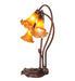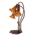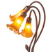 One of the most popular Louis Comfort Tiffany styled lamps on the market today, recreating his famous Favrile design from the early 1900's. This mottled rich Amber shaded 3 Light Accent Lamp offers an attractive, delicate design featuring shades mouth blown of fine art glass. Lily shades are suspended from stems delicately winding above a Lily pad base finished by hand in Mahogany Bronze.