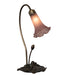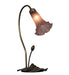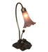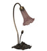 One of the most popular Louis Comfort Tiffany styled lamps on the market today. This Pond Lily accent lamp recreates the famous Favrile design from the early 1900s. The Lavender shade features a flowering Lily created from fine mouth blown art glass. The shade is embraced by a delicate metal stem attached to a charming Lily pad base hand finished in Mahogany Bronze. UL and cUL listed for dry locations.