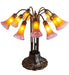 One of the most popular Louis Comfort Tiffany styled lamps on the market today, recreating his famous Favrile design from the early 1900's. This mottled Amethyst tipped Amber shaded Ten Light Table Lamp offers an attractive, delicate design featuring shades mouth blown of fine art glass. Lily shades are suspended from stems delicately winding above a Lily pad base finished by hand in Mahogany Bronze.