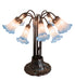 One of the most popular Louis Comfort Tiffany styled lamps on the market today, recreating his famous Favrile design from the early 1900's. This mottled Indigo Blue tipped Pink shaded Ten Light Table Lamp offers an attractive, delicate design featuring shades mouth blown of fine art glass. Lily shades are suspended from stems delicately winding above a Lily pad base finished by hand in Mahogany Bronze.
