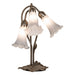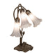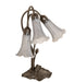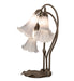 Recreating the popular Tiffany design from the early 1900s... This table lamp offers an attractive, delicate design featuring three stunning Grey art glass shades. The Pond Lily shades are embraced by an elegant cast metal base that is finished by hand in Mahogany Bronze. UL and cUL listed for dry locations. The Pond Lily Table Lamp is featured in our American designed, handcrafted Favrile Style Glass Lighting Collection. Each shade is a unique work of art with color variations based on natural ingredients inherent in the glass. Contact us if color matching is critical when ordering multiple items.