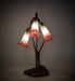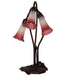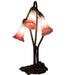 One of the most popular Louis Comfort Tiffany styled lamps on the market today, recreating his famous Favrile design from the early 1900's. This softly mottled Plum Pink and White shaded 3 Light Accent Lamp offers an attractive, delicate design featuring shades mouth blown of fine art glass. Lily shades are suspended from stems delicately winding above a Lily pad base finished by hand in Mahogany Bronze.