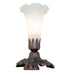 One of the most popular Louis Comfort Tiffany styled lamps on the market today, recreating his famous Favrile design from the early 1900's. This mottled Winter White shaded One Light Accent Lamp offers an attractive, delicate design featuring a shade of mouth blown of fine art glass. Lily shades are seated in an elegant base finished by hand in Mahogany Bronze.