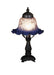 A scalloped edge graces this lovely Petal Pink and Indigo Blue mottled glass bell shade paired with a Mahogany Bronze finished mini lamp base.