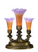 One of the most popular Louis Comfort Tiffany styled lamps on the market today, recreating his famous Favrile design from the early 1900's. This mottled Amethyst tipped Amber shaded Three Light Mantelabra offers an attractive, delicate design featuring shades mouth blown of fine art glass. Lily shades are seated in an elegant base finished by hand in Mahogany Bronze.