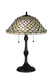 Diamond patterns of Iridized Ivory and Ivy Green are accented all over with sparkling clear jewels droplets in this elegant Victorian style shade. The versatile stained glass shade is created using copperfoil construction, a process developed by Louis Comfort Tiffany. The table lamp base is hand finished in a warm Mahogany Bronze. "