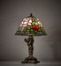 The most beloved of all floral beauties. The Rosebush is beautifully represented in this stunning reproduction of a Tiffany Studio Classic. Petal Pink, Romantic Red, and Beautiful Blue art glass Roses ramble on a maze of Garden Green leaves. The luxurious shade is created using the famous Meyda Tiffany copperfoil construction and paired with an elegant cast metal base featuring a Cherub finished in Mahogany Bronze. The lamp is ideal for placement in picture windows and on tables and desks in homes and offices. The Tiffany Rosebush Cherub Accent Lamp is included in our American-designed, handcrafted Tiffany Reproduction Collection. UL & cUL listed for dry locations. Each shade is a unique work of art with color variations based on natural ingredients inherent in the glass.