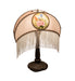 This exquisite table lamp will add elegance and romance to any room in a residence or business. A beautiful, uniquely shaped Ivory Textrene shade is highlighted with a Reverse Handpainted Medallion featuring a stunning spray of colorful Roses. The lovely curvaceous shade is accented with color-coordinated Ivory and Clear Glass Beaded Fringe and paired with an elegant cast metal base featured in a Mahogany Bronze finish. Create a dramatic design statement in homes, hotels, and other spaces nationwide, from Williamsburg, Virginia, to Frankenmuth, Michigan, to Luckenbach, Texas. The Reverse Painted Roses Fabric with Fringe Table Lamp is included in our American-designed, handcrafted Fabric & Fringe Lighting Collection. UL & cUL listed for dry locations.