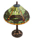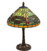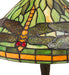 Elegant and stunning. This version of Tiffany Studio's most beloved stained glass dragonfly design is modeled after the original hanging-head dragonfly. Diving dragonflies with glowing Scarlet jeweled eyes and delicate metal filigree wings circle over hand-cut and copper foiled pieces of Amber accented Pond Green art glass, representing an early evening sky reflecting on rippling water. The table lamp base is finished in a warm hand-applied Mahogany Bronze. The lamp illuminates tables and desks in homes, offices, and restaurants from Boston, Massachusetts, to Des Moines, Iowa, to Billings, Montana. The Dragonfly W/Twisted Fly Mosaic Base Table Lamp is included in our American-designed, handcrafted Stained Glass Collection. Each shade is a unique work of art with color variations based on natural ingredients inherent in the glass. UL and cUL listed for dry locations.