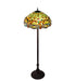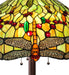 Inspired by one Tiffany Studio's classic Dragonfly lighting masterpiece. Orange dragonflies with glowing Red jeweled eyes and filigree topped Multi-colored wings dive over a Green and Orange background. The stunning shade is accented with Red, Green and Amber glass jewels. The art glass shade is created using the famous Meyda Tiffany copperfoil construction. This Tiffany Reproduction floor lamp features a base in a warm hand applied Mahogany Bronze. UL and cUL listed for dry locations.