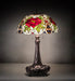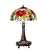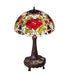 The Renaissance Rose lamp features an art glass shade with Cabernet Red Roses framed in Sunset Green leaves and Ivory scrolls, on a Lavender and Plum Bronze lace background. This beautiful art glass shade is complemented with a table lamp base in a Mahogany Bronze finish. The shade is accented with Red jewels and created using the famous Meyda Tiffany copperfoil construction process. UL and cUL listed for dry locations. Each shade is a unique work of art with color variations based on natural ingredients inherent in the glass. Contact us if color matching is critical when ordering multiple items.