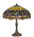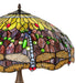 This version of a most beloved stained glass dragonfly design from Tiffany Studios is modeled after the original hanging head dragonfly. Diving Blue dragonflies with glowing Red jeweled eyes and delicate metal filigree wings circle over hand cut and copper foiled pieces of Lakeside Blue and Pond Green glass that represent rippling water. Green and Red jewels accent the background. This lovely shade is created using the famous Meyda Tiffany copperfoil construction and enhanced with a Mahogany Bronze finished lamp base. UL and cUL listed for dry locations. Each shade is a unique work of art with color variations based on natural ingredients inherent in the glass. Contact us if color matching is critical when ordering multiple items.