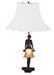 Charming, lighted sculpture of blown art glass and cast iron head, arms, legs and base, in rich Mahogany Bronze finish. white fabric shade.
