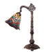 Recreating one of Tiffany's most beloved designs. Mauve with Beige, Pink, Orange, and Gray art glass adorn this shade, while feathers feature Turquoise, Blue, and Purple. A scalloped crest of Purple, Blue, Orange, and Green art glass edges the shade, which is created using the Meyda Tiffany copperfoil construction and enhanced with an elegant decorative cast metal lamp base finished in a warm Mahogany Bronze. Ideal for illuminating tables and desks in homes, banks, and libraries from Exeter, New Hampshire, to Scottsdale, Arizona, to Billings, Montana.The Tiffany Peacock Feather Bridge Arm Table Lamp is featured in our American-designed, handcrafted Tiffany Reproduction Collection. UL & cUL listed for dry locations. Each shade is a unique work of art with color variations based on natural ingredients inherent in the glass.