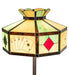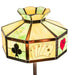 Play your cards right with this winning hand poker floor, a Meyda original stained glass lighting design. The high cards are etched and inlay painted on Bidding Beige glass while suit symbols of Black and Red float on a Currency Green sky. The shade is accented with Bankroll Brown granite glass bands and complemented with a hand finished Mahogany Bronze floor base with White Onyx Marble accents. The Poker Face Floor Lamp is featured in our American designed, handcrafted Stained Glass Lighting Collection. UL and cUL listed for dry locations. Each shade is a unique work of art with color variations based on natural ingredients inherent in the glass. Contact us if color matching is critical when ordering multiple items.