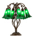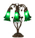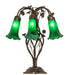 Inspired by Tiffany's famous Pond Lily design from the early 1900s... This table lamp is created with six mouth blown shades featuring Green art glass. The Pond Lily shades are embraced by an elegant Cast Bronze Base featuring a rich Mahogany patina. The Pond Lily Table Lamp is included in our American designed, handcrafted Favrile Lighting Collection. UL and cUL listed for dry locations. Each shade is a unique work of art with color variations based on natural ingredients inherent in the glass. Contact us if color matching is critical when ordering multiple items.