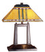 With their love of geometric forms, architects of the Prairie School interpret organic objects into simplified lines. The Meyda Tiffany Prairie Corn oblong table lamp shade has rows of Chili Red and Wheat kernels and stalks of Bronzed Jade against a Maize Gold background. The stained glass shade is paired with a simple Mission style lamp base in a Mahogany Bronze finish.