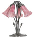 Recreating the famous Tiffany design from the early 1900s. This elegant table lamp features five Lavender Favrile Style Pond Lily-shaped art glass shades. An elegant cast metal base embraces the Lily shades with floral-style fitters finished by hand in Mahogany Bronze and inspired by antique lighting in homes from the Bowery in New York City, to Philadelphia, Pennsylvania, to San Francisco, California. Ideal for placement on an occasional table or credenza in a fine home or hotel. The Tiffany Pond Lily 5 Light Table Lamp is included in our American-designed, handcrafted Favrile Glass Lighting Collection. UL and cUL listed for dry locations. Each shade is a unique work of art with color variations based on natural ingredients inherent in the glass.