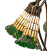 Inspired by the famous Tiffany design from the early 1900s. This table lamp features five stunning Amber and Green stained glass shades created using the famous Meyda Tiffany copperfoil construction technique. An elegant cast metal base with winding vines and a lily pad embrace the shades with floral-styled fitters finished by hand in Mahogany Bronze and inspired by antique lighting in homes from the Bowery in New York City, to Philadelphia, Pennsylvania, to San Francisco, California. Ideal for placement near a chair or table in living spaces, dining areas, and other settings in hospitality and residential settings. The Stained Glass Pond Lily 5 Light Table Lamp is included in our American-designed, handcrafted Stained Glass Lighting Collection. UL and cUL listed for dry locations. Each shade is a unique work of art with color variations based on natural ingredients inherent in the glass.