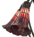 Inspired by the famous Tiffany design from the early 1900s. This table lamp features five stunning Red stained glass shades created using the famous Meyda Tiffany copperfoil construction technique. An elegant cast metal base with winding vines and a lily pad embraces the shades with fitters finished by hand in Mahogany Bronze and inspired by antique lighting in homes from the Bowery in New York City, to Philadelphia, Pennsylvania, to San Francisco, California. Ideal for placement on a desk or table in living spaces, dining areas, and other spaces in hospitality and residential settings. The Stained Glass Pond Lily 5 Light Table Lamp is included in our American-designed, handcrafted Stained Glass Lighting Collection. UL and cUL listed for dry locations. Each shade is a unique work of art with color variations based on natural ingredients inherent in the glass.