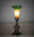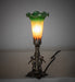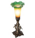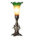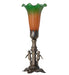 Recreating the famous Tiffany design from the early 1900s. This accent lamp features a stunning shade that is mouth-blown of Amber/Green Favrile-styled art glass. The Pond Lily shade is embraced by an elegant Twin Maidens figurine cast metal base finished by hand in Antique Brass. Perfect for homes and restaurants from Corona, Queens and Laurel Hollow, Long Island, New York, to Winter Park, Florida, to Chicago, Illinois. The Tiffany Pond Lily Maidens Mini Lamp is included in our American-designed, handcrafted Favrile Glass Collection. UL and cUL listed for dry locations. Each shade is a unique work of art with color variations based on natural ingredients inherent in the glass.