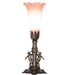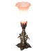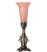 Recreating the famous Tiffany design from the early 1900s. This accent lamp features a stunning shade that is mouth blown of Pink Favrile-styled art glass. The Pond Lily shade is embraced by an elegant Twin Maidens figurine cast metal base finished by hand in Antique Brass. The lamp design is perfect for homes and restaurants from Corona, Queens and Laurel Hollow, Long Island, New York, to Winter Park, Florida, to Chicago, Illinois. The Tiffany Pond Lily Maidens Mini Lamp is included in our American-designed, handcrafted Favrile Glass Collection. UL and cUL listed for dry locations. Each shade is a unique work of art with color variations based on natural ingredients inherent in the glass.
