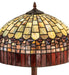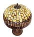 In the early 20th century, Tiffany Studios used it's artful mastery to develop the look of a woven fabric with a fringed skirt from art glass. Meyda Tiffany has recreated this shade with Amber Plum glass fringe suspended from a domed brickwork of Emerald, Cobalt and Ruby tinted Honey glass. Hand cut and copper foiled glass pieces make up this stately table lamp with Mahogany Bronze finish.