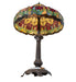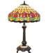 Pearlescent Beige glass panels with Plum Pink Colonial Tulips Setting atop Spring Green leaves are accented with Amethyst jewels and waves of Mahogany Granite glass. The shade is enhanced with a Mahogany Bronze finished table base that features Onyx accents. The lamp is perfect for featuring in a picture window and on desktops or credenzas. The Colonial Tulip Table Lamp is featured in our American-designed, handcrafted Stained Glass Lighting Collection. The lamp is UL and cUL listed for dry locations. Each shade is a unique work of art with color variations based on natural ingredients inherent in the glass.
