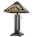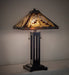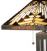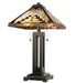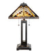 Like gazing out your window across the warm desert at sunset, interlocking tiles of Sand tone Beige glow behind the sun, glistening Orange, Amber Green, and Brown rays. A Root Brown border surrounds all this intricate design. The stunning Nuevo Mission shade is created using the famous Meyda Tiffany copperfoil construction method and enhanced with an elegant metal base featured in a warm Mahogany Bronze finish. Install these handsome lamps to illuminate picture windows, desks, and tables in Buffalo, New York, Houston, Texas, and Fremont, California. The Nuevo Mission Table Lamp is included in our American-designed, handcrafted Stained Glass Lighting Collection. UL and cUL listed for dry locations. Each shade is a unique work of art with color variations based on natural ingredients inherent in the glass.