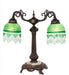 A charming nostalgic table lamp that is perfect for nearly any room. This Roussillon features two stunning Green Mottled Art Glass shades that are color coordinated with delicate Green and White glass beaded fringe. The elegant cast metal base in a Mahogany Bronze finish with a White marble accent embraces the Victorian-inspired shades. This wall sconce is perfect for placing on tables in hallways and living spaces in fine Victorian homes from Cape May, New Jersey, to Cincinnati, Ohio, to Chicago, Illinois. The Roussillon 2 Arm Table Lamp is featured in our American-designed, handcrafted Boudoir Lighting Collection. UL and cUL listed for dry locations. Each shade is a unique work of art with color variations based on natural ingredients inherent in the glass.
