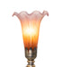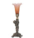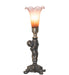 Inspired by the famous Tiffany design from the early 1900s. This mini lamp features a stunning shade mouth blown of Amber and Purple Favrile-style art glass. The Pond Lily shade is embraced by an elegant cast base featuring a charming cherub finished by hand in Antique Brass. The Pond Lily Mini Lamp is featured in our American-designed, handcrafted Favrile Glass Collection. UL and cUL listed for dry locations. Each shade is a unique work of art with color variations based on natural ingredients inherent in the glass.